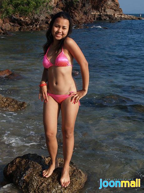 Joon Mali: Asian doll flashes her boobies in tiny pink bikini outside