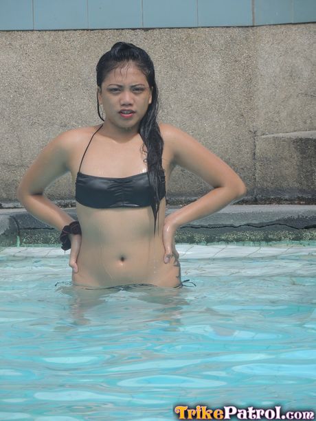 Barfine2cash: Asian teen amateur girl strips and shows her small tits and pussy poolside
