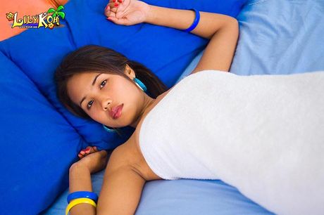 Lily Koh: Brown Thai cutie Lily Koh wearing only a towel and shy smile