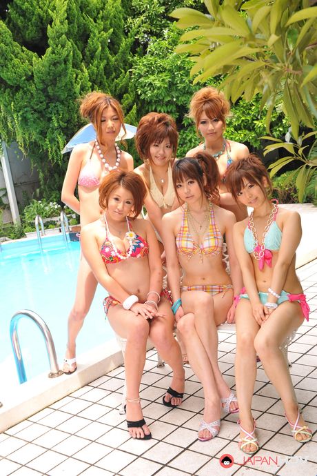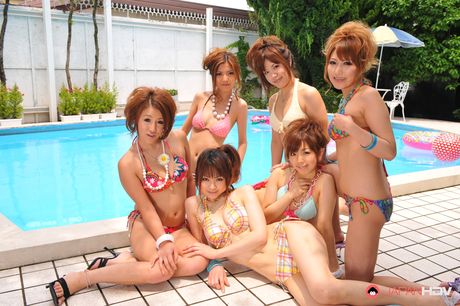 Japan HDV: Japanese babes in bikinis pose together seductively by the pool