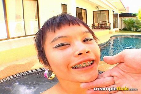 Creampie Thais: Little Thai teen with braces named Meme takes a big cock and creampie